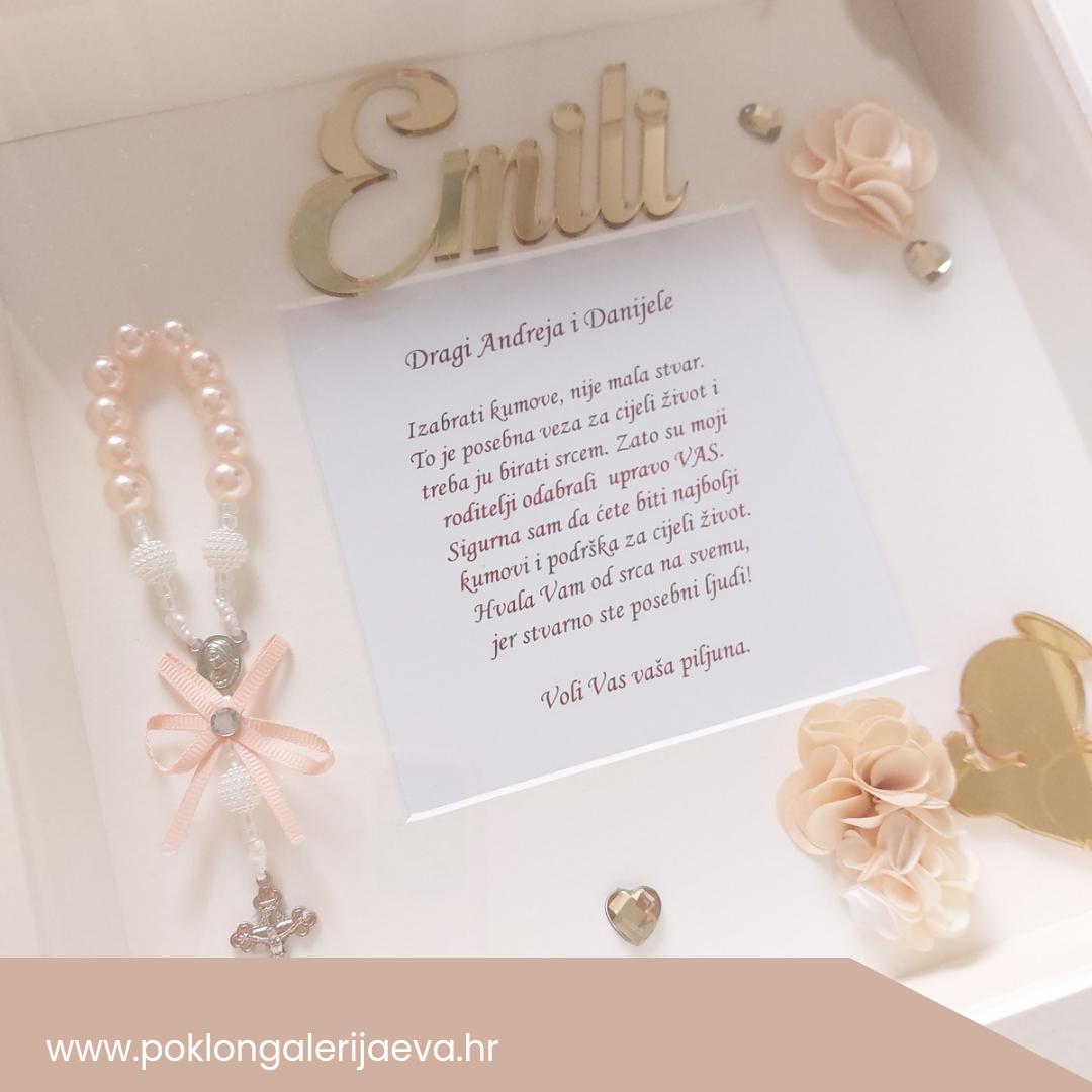 U napomene kod naručivanja upišite ime djeteta koje želite u poklon okviru. Ako želite promjeniti tekst, ime kume ili staviti datum takoder upišite obavezno sve u napomene.