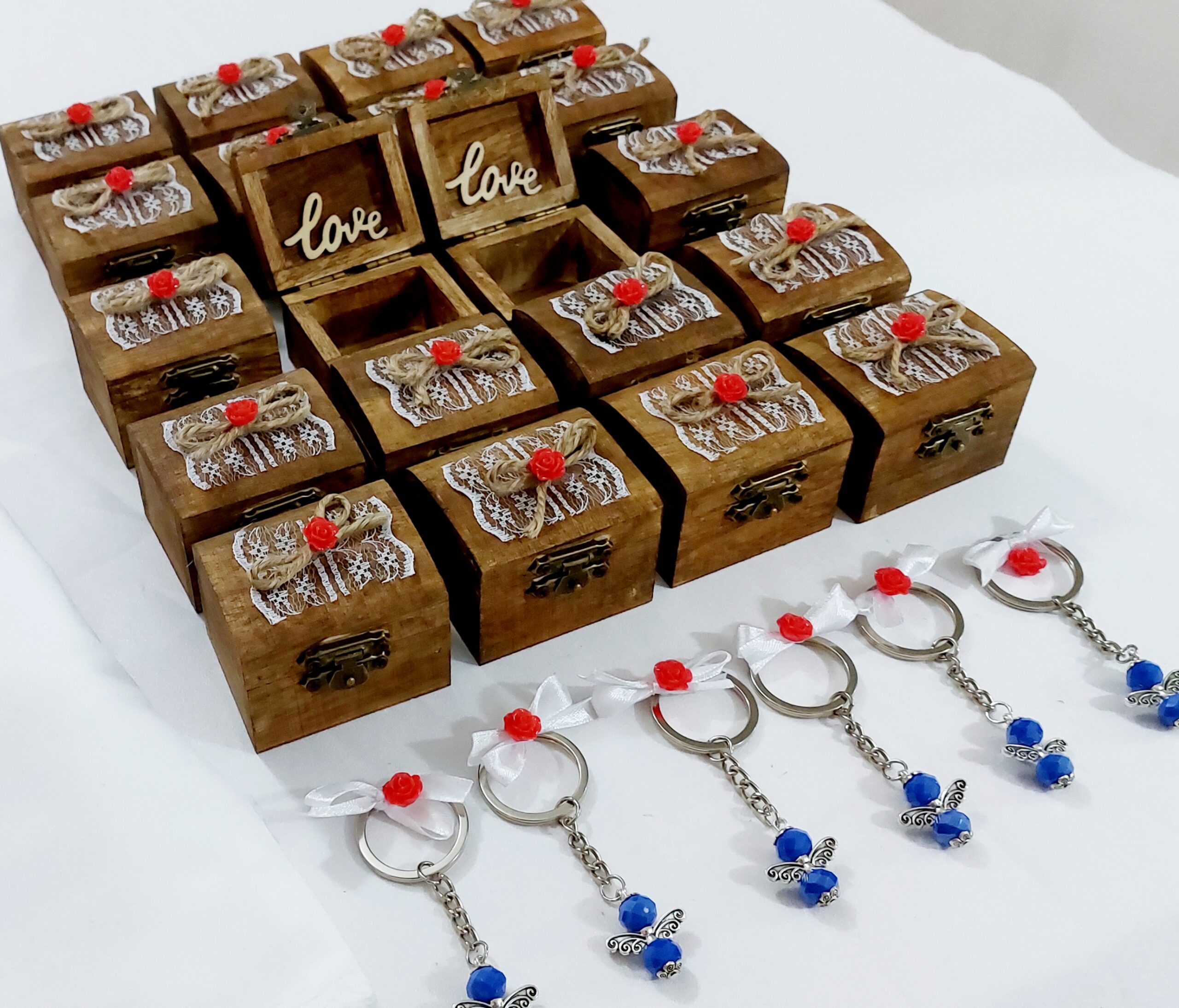 • Drvena kutija ukrašena čipkom, šagom i plastičnim cvjetićem