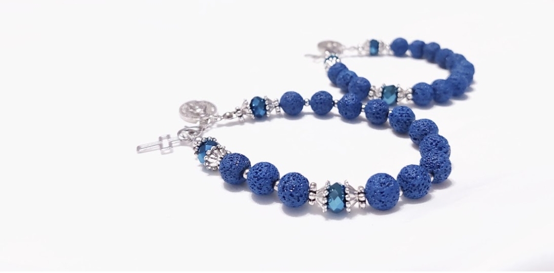 Krunica narukvica napravljena od kamene lava i staklenih kristalića, sa komponentama od metala.